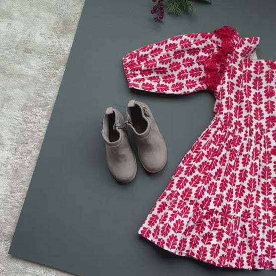 It features a Red-White color, beautiful print and is made of cotton fabric for a comfortable and lightweight feel. The dress also features a lace yoke to give it a unique and stylish look, perfect for any occasion.