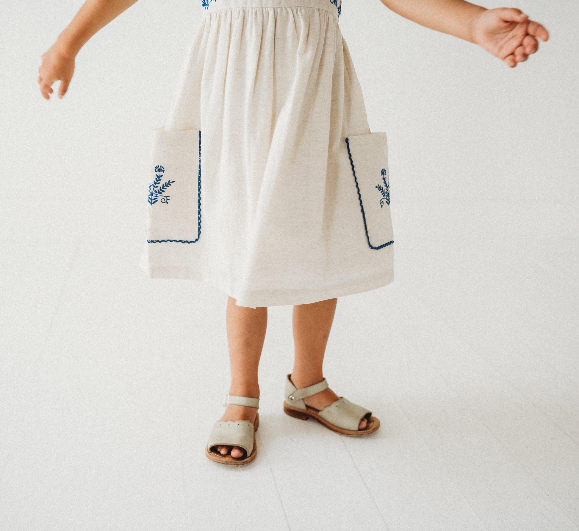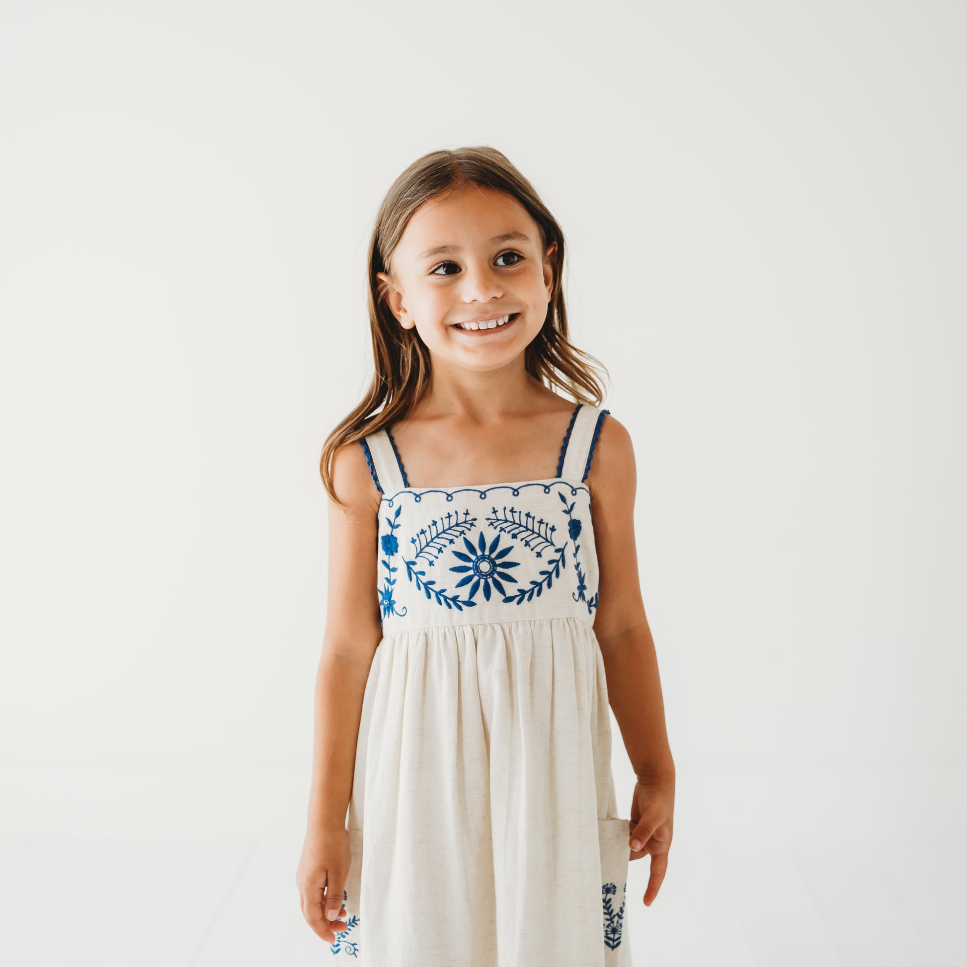 Elevate your little one's wardrobe with our Azurea Linen Embroidery Dress, a masterpiece of handmade craftsmanship. This exquisite dress features: